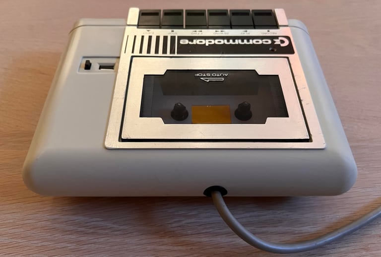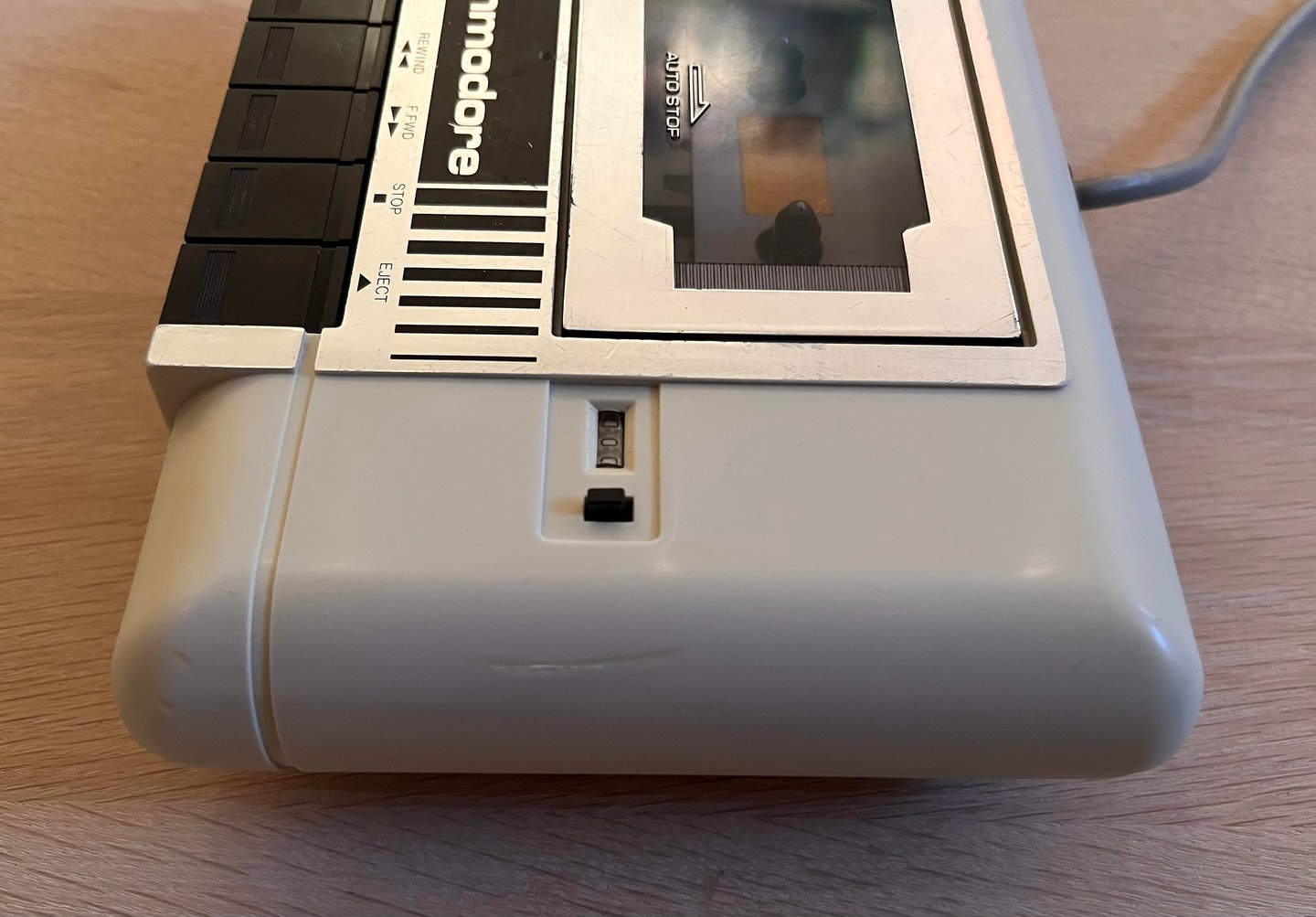 It is easy to see that this is a "Made in Japan" version of the Commodore datasette: the counter is white and behind a small window, and the red LED is placed above the REC button. The datasette seems from the outside to be in OK condition, but it is full of "burn marks". These are not real burn marks, but a result of the cable being twisted around the casing for a long time. I do not know if this datasette works or not at the time of writing.