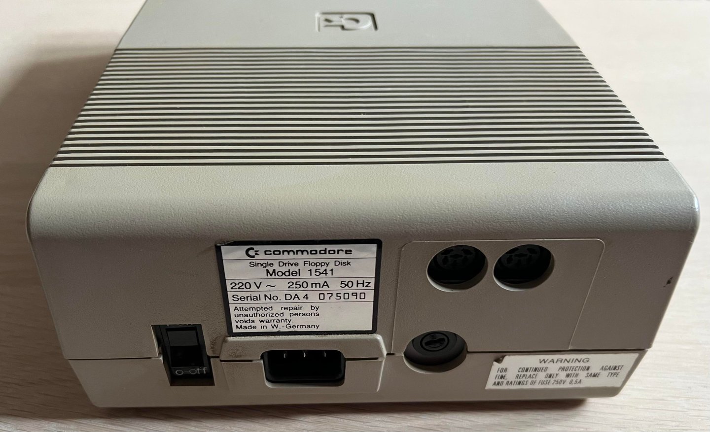 From the outside the 1541 disk drive looks to be in quite ok condition. It is slightly yellowed and dirty, and there is a small part broken off on the right hand side - but not very visible. The opening mechanism also seem to work.