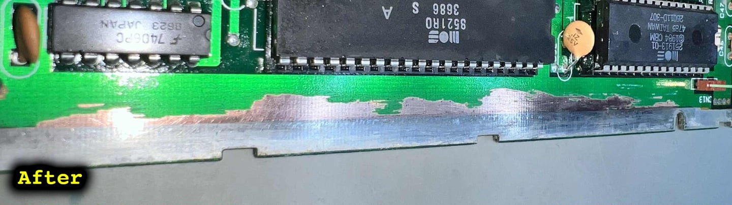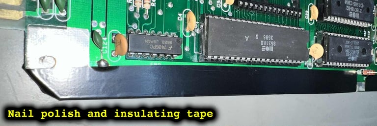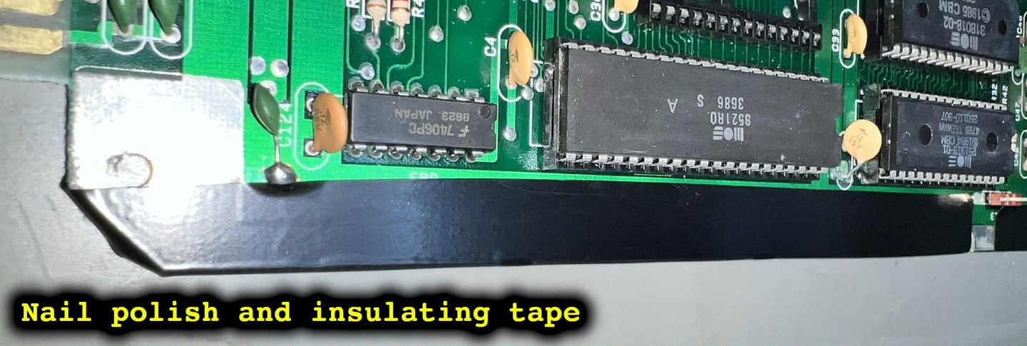 There are some corrosion of the left hand side of the mainboard. This does not currently affect the machine in any way, but as a measure to prevent the corrosion from expanding the area is cleared. To to this a combination of a sharp pick tool, brass brush, vinegar and isopropanol is used. Finally, the area is covered with some transparent nail polish and some black insulating tape. See pictures below.