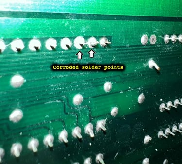 There are some signs of corrosion on the right hand side of the mainboard (front side). The corrosion appears to be in the ground plane (see picture).