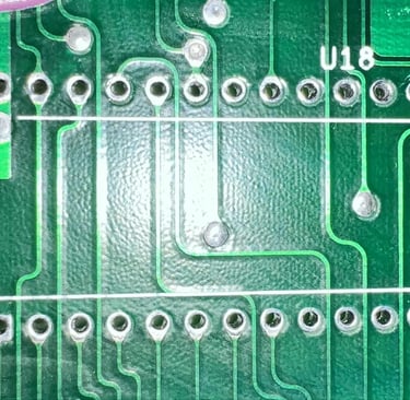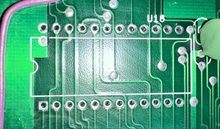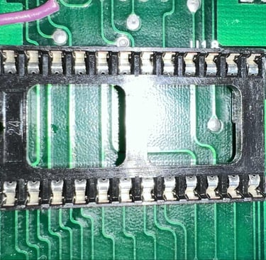 Continuing the process of resoldering solder points I notice something: the solder points for pin 22 and 23 (U4 CIA#2) appear very crusty . So crusty that they will not reflow solder until they are scraped and cleaned. Feels like I am clinging to a straw here, but the CIAs are vital for the cursor to work. And both the pin 22 and 23 are important signals as they represent R/W and CS respectively. It is hard to see from the picture below, but pin 22 and 23 are quite corroded.