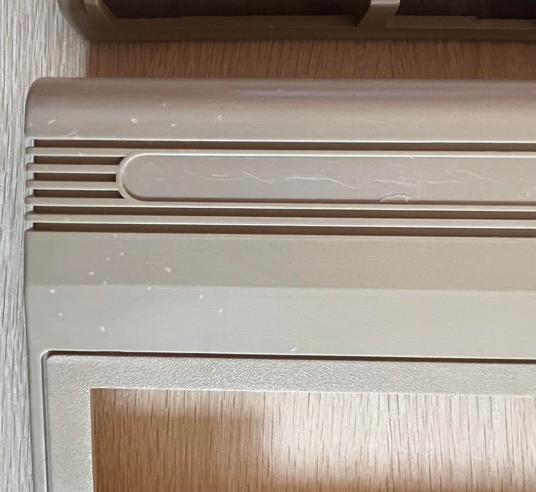 The result from the cleaning and retrobrighting is quite good. There are still some small spots (?) and marks which is not possible to remove without sanding the whole casing, but I do not think that is a good idea. You can notice it in the area to the left side and below the Commodore 64 badge. It is better to keep it the way it is.