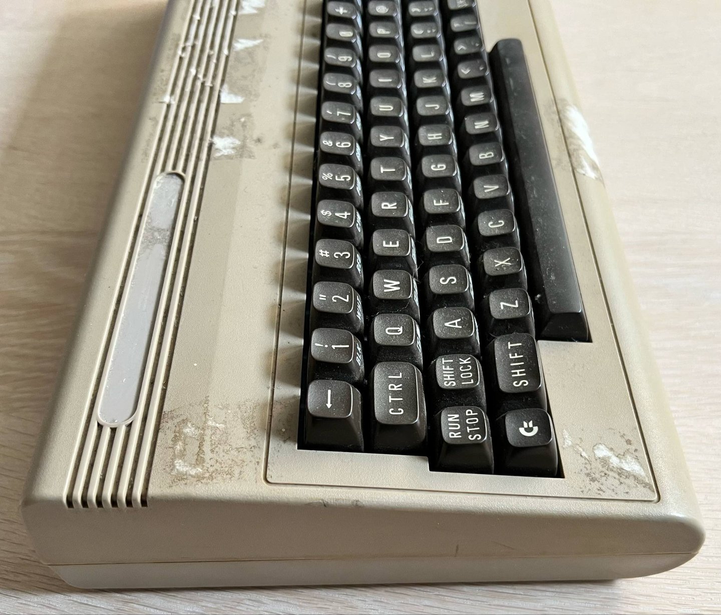 This machine, reportedly from 1986, has seen better days. The "Commodore 64" badge is missing, quite dirty and residue from stickers (oh, those 80´s). But, aside from that, the machine seems to actually be in good overall mechanical condition. The keyboard feels ok, all three screws are in place at the bottom and I can not see any significant outer damage. Whether or not this machine works at all I do not know yet.