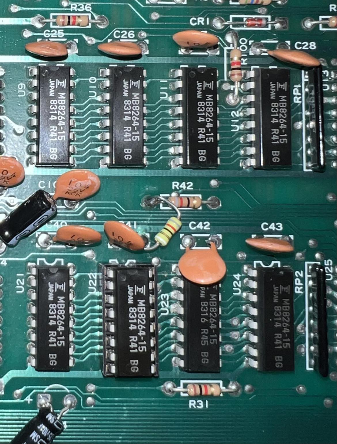 Something else can also be seen from the picture above; U22 RAM chip has been socketed. My theory is that this RAM chip was detected faulty at production time and then replaced (and socketed). Notice that that the date code on these RAM chips are almost identical (differ by a couple of weeks only) so I guess they just replaced it with a new RAM chip at factory.