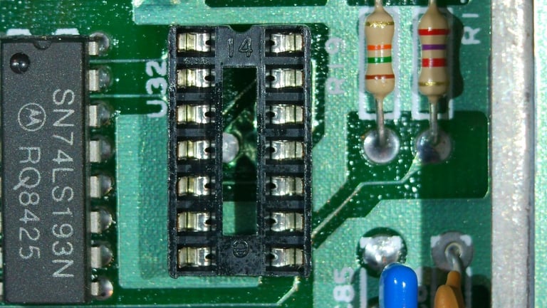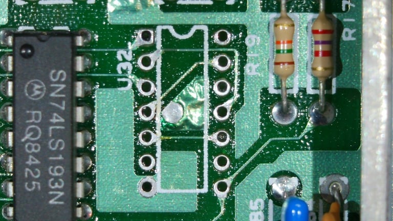The 7406 is also part of the "glue logic" in the machine and is part of the memory management circuitry. This chip is also desoldered and a socket installed, but unfortunately this is not the fault either. No pads or traces were lifted during desoldering - see picture below.