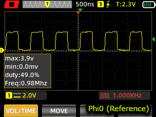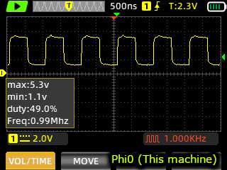 Using the oscilloscope to probe the signals on the CPU I discover some weird signal levels on pin 24, 25 and 26 on this chip. These signals should be either 0 V or 5 V, but these are something in between (?). See picture below from pin 25 on the CPU.