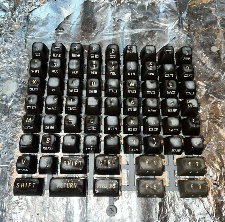 All keys are carefully removed with keycap puller and placed in mild soap water for 24 hours. Note that behind each key is a spring, and that the spring for the spacebar is a bit larger than the rest. So it is wise to place this spring in a separate bag when doing the refurbishment.