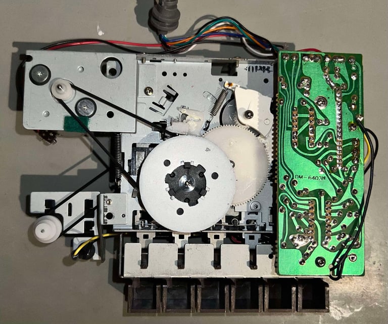 To remove the PCB from the interior mechanics, the two small machine screws are removed. Before lifting the PCB, the two black wires are carefully pulled away from the thin notch in the PCB (see picture above). The wires are bundled together at the back with a transparent rubber thread which is also carefully removed.