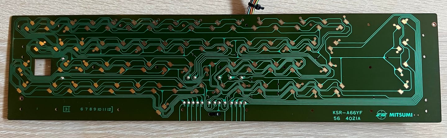 Below is a picture of the keyboard PCB after cleaning - this is a "KSR-A66YF 56 4021 B-01" keyboard from Mitsumi which is one of the most common (aka the "B" version").