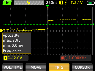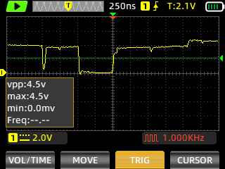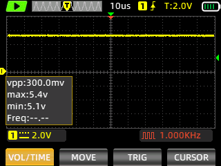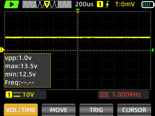 This is the 6569 chip in use. Therefore the VDD=12 V and the scope is set to 10 V / DIV