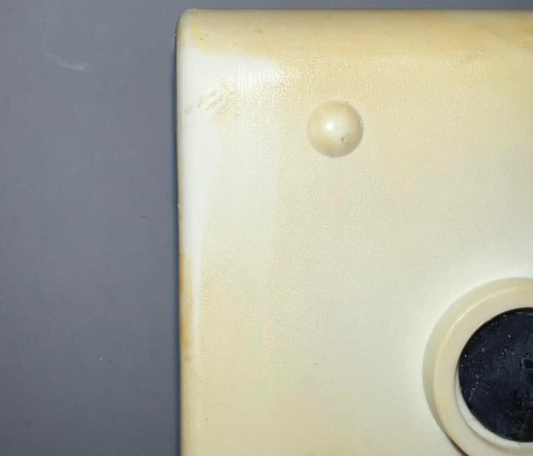 As previously mentioned the casing is very yellowed, dirty and with several cable burn marks. This is going to be a real challenge, but let´s do our best! The first thing to do is to properly clean both the top- and bottom cover. But before I can do that the LED is removed. This is done by first removing the circular plastic clip, then pushing firmly the LED from the outside towards the inside of the cover until til LED pops out and then finally pushing the plastic clip forward and out of the cover. See little picture gallery below.