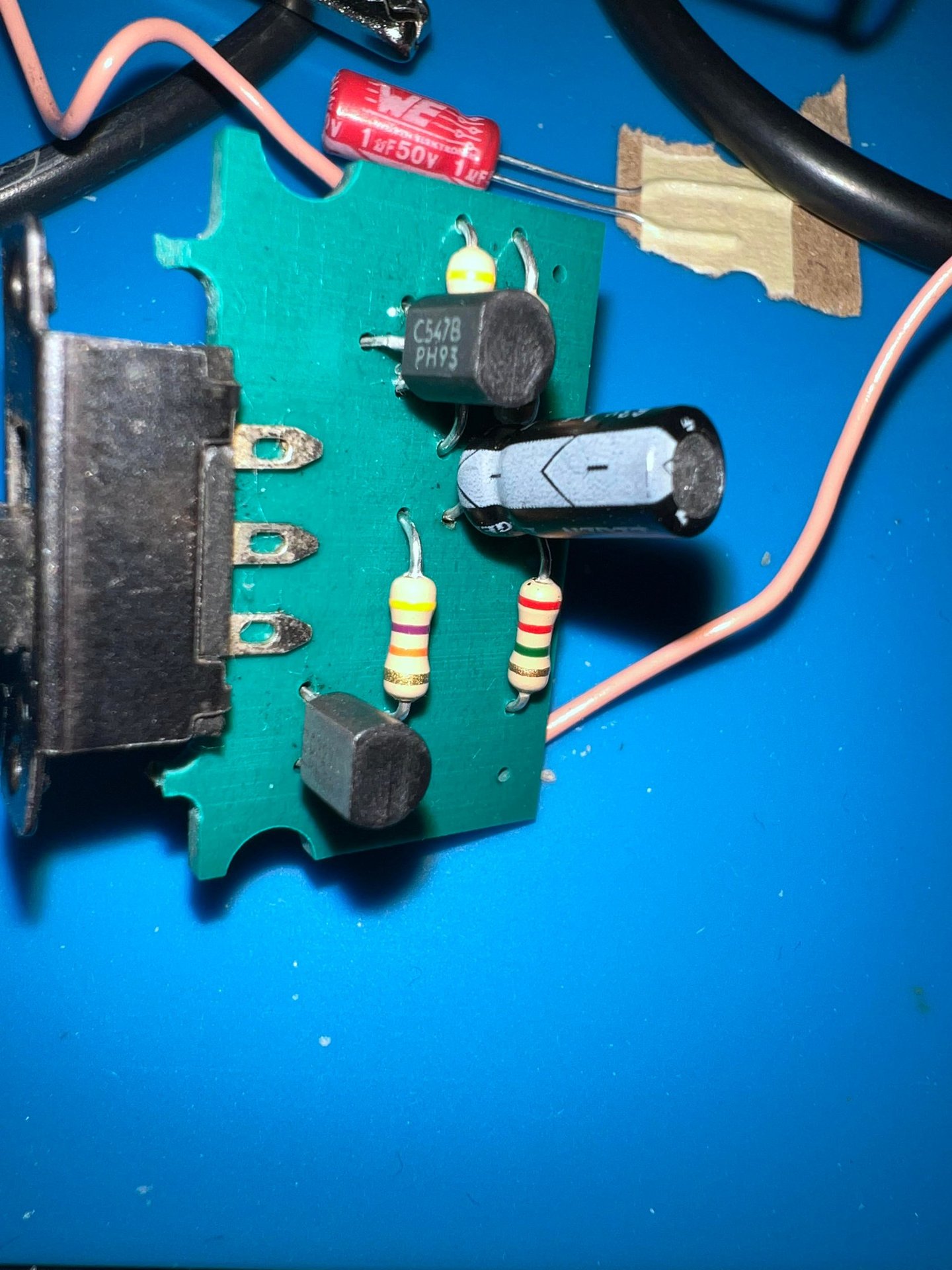 There is a small PCB in the joystick consisting of a couple of transistors (C547B and C327), four resistors and a 1 uF 63V capacitors. The purpose of this circuit is to generate the auto fire pulses. Although not crucial for the operation, the electrolytic capacitor is replaced as a homage to the engineers who made it. As old electrolytic capacitors dry out they loose their capacitance. And as a consequence of this the pulse frequency would likely be different from what the engineers designed it to be.