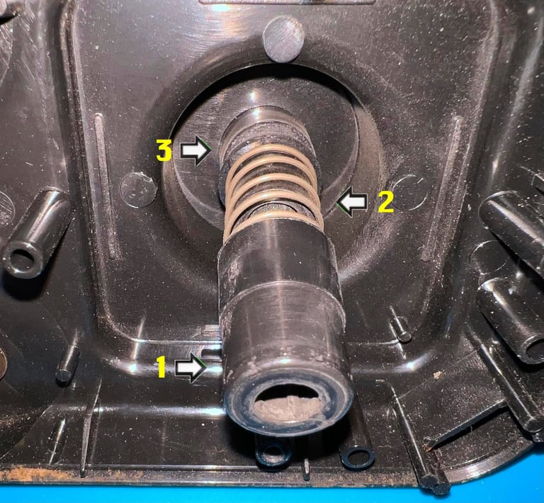 To disassemble the joystick shaft the e-clip is removed first (see picture below). Then the two plastic parts (1 and 3) and the spring (2) are removed before the joystick shaft is slid out of the bottom cover.